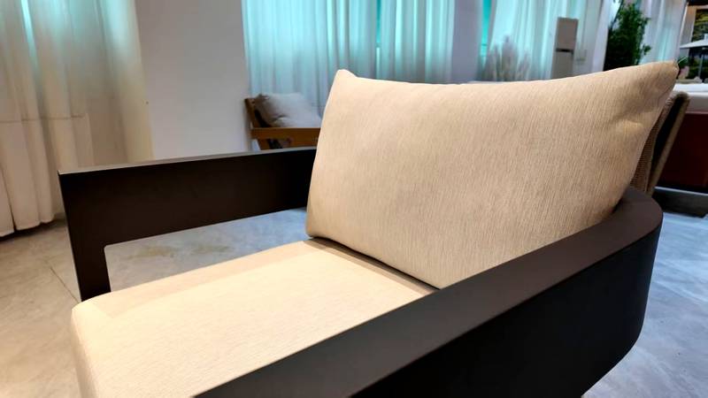 软包搭配上,TYLER系列选用米白色专业防水面料,靠背与坐垫饱满厚实、舒适透气,既能有效抵御户外风雨、潮气,又具备防霉易清洁的优势,日常打理省心便捷。米白色软包与深灰色铝合金框架形成经典的色彩对比,视觉上干净通透,自带高级质感,让户外空间摆脱沉闷,更具层次感与设计感。(嘉鹏户外家具工厂:136*7021*571*8)